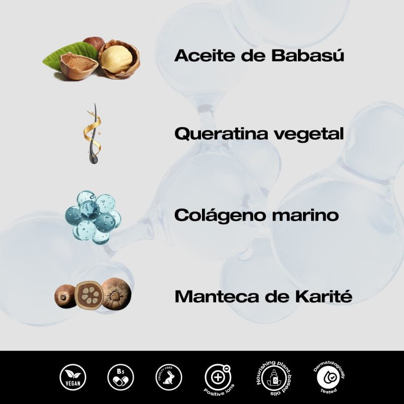 Estos ingredientes no solo hidratan y reparan el cabello, sino que también mejoran notablemente su manejabilidad, dejándolo más suave, brillante y libre de encrespamiento.