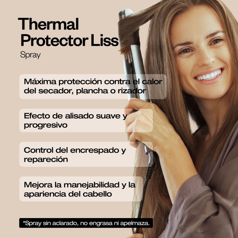 El Keratin-Plex Thermal Protector Liss es un protector térmico en formato spray diseñado, principalmente, para proteger el cabello cuando se usa herramientas de calor como planchas y secadores. Además, también tiene la función de fortalecer el cabello, evitando así su rotura, combatir el encrespamiento y ofrecer un efecto de alisado progresivo.